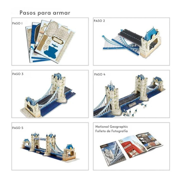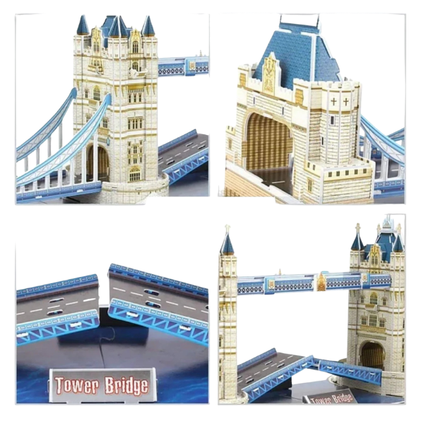 El set está diseñado para armarse sin necesidad de pegamento ni tijeras, lo que garantiza un proceso limpio y seguro para todas las edades. Una vez terminado, tendrás una réplica detallada del London Tower Bridge, perfecta para decorar tu hogar, oficina o para añadir a tu colección de monumentos 3D.