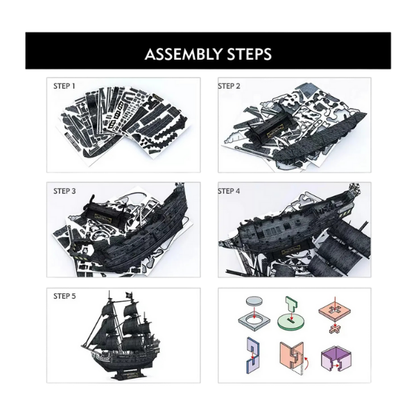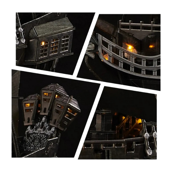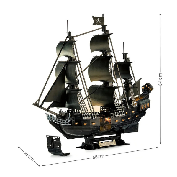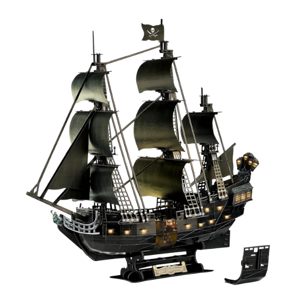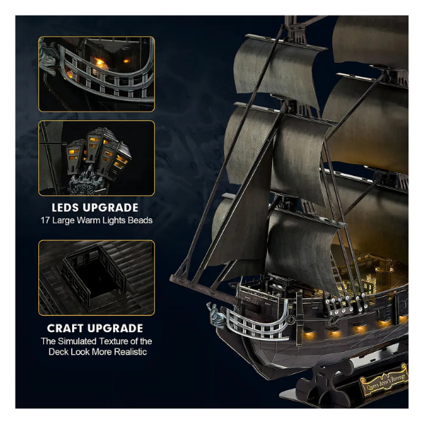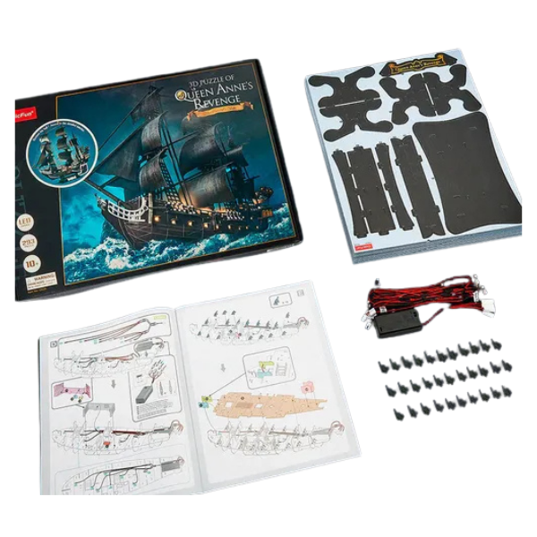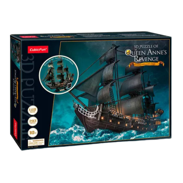 Embárcate en una aventura pirata con el rompecabezas 3D CUBICFUN Queen Anne's Revenge con luces LED, una réplica impresionante del temido barco del legendario pirata Barbanegra. Diseñado con un estilo oscuro y realista, este modelo captura cada detalle del mítico navío, desde sus velas negras hasta su imponente estructura iluminada.