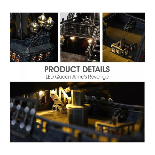 Ofrece una experiencia de construcción entretenida, educativa y visualmente impactante. Gracias a su sistema de iluminación LED integrado, el barco cobra vida con un efecto nocturno espectacular que lo convierte en una pieza decorativa ideal para coleccionistas, aficionados a la historia o fanáticos del mundo pirata.