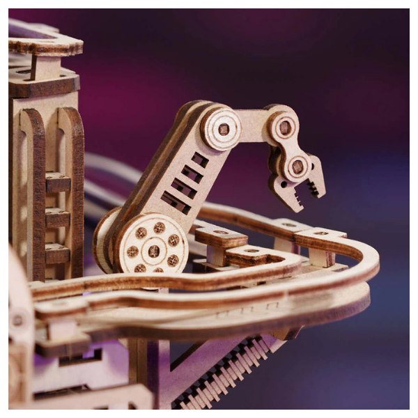 Este modelo recrea una pista de canicas con estética industrial en forma de control de videojuego. Una vez armado, se convierte en un juego totalmente funcional donde puedes guiar la bola a través de múltiples rutas usando controles mecánicos en tiempo real.