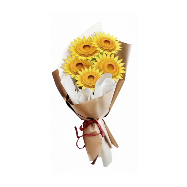 Se trata de un rompecabezas tridimensional tipo DIY (hazlo tú mismo) enfocado en un ramo de girasoles.