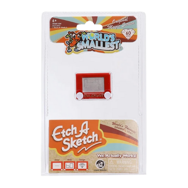 Revive la nostalgia del clásico juguete de dibujo que marcó generaciones, ahora en versión miniatura totalmente funcional. Este World’s Smallest Etch A Sketch te permite crear dibujos únicos girando las perillas, igual que el original, ¡pero en un formato compacto y portátil!