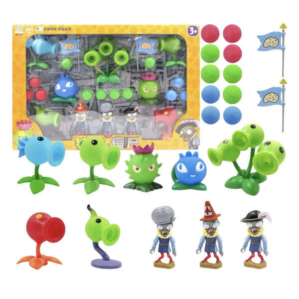 El set incluye diferentes tipos de plantas defensivas con diseños coloridos y dinámicos, además de zombis con cascos y sombreros característicos. Los lanzadores permiten colocar las pelotas y dispararlas manualmente para enfrentar a los zombies, haciendo la experiencia mucho más interactiva y entretenida.