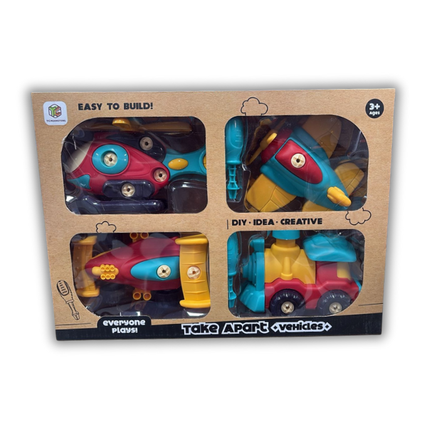 El Take Apart Vehicles es un set de vehículos armables que permite a los niños construir, desmontar y volver a armar sus propios autos, aviones y cohetes. Perfecto para desarrollar habilidades motrices, coordinación y pensamiento lógico mientras se divierten.