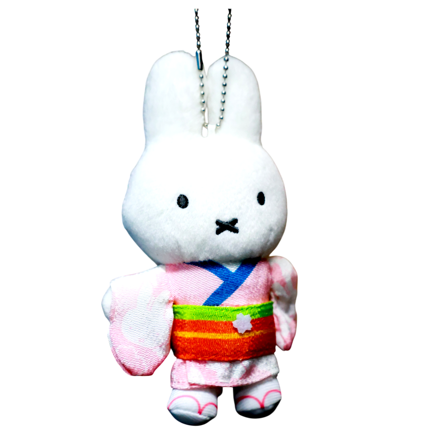 Diseño Detallado: Miffy viste un kimono rosa con patrones florales sutiles, complementado con un obi (faja) multicolor en tonos naranja, verde y amarillo, y un delicado cuello en color azul.