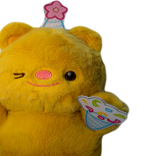 Este adorable osito amarillo llega para llenar de ternura cualquier rincón. Suave al tacto y con una expresión encantadora guiñando un ojo, sostiene un divertido helado de colores que lo hace aún más especial. Ideal para regalar, decorar o acompañar en momentos de descanso.