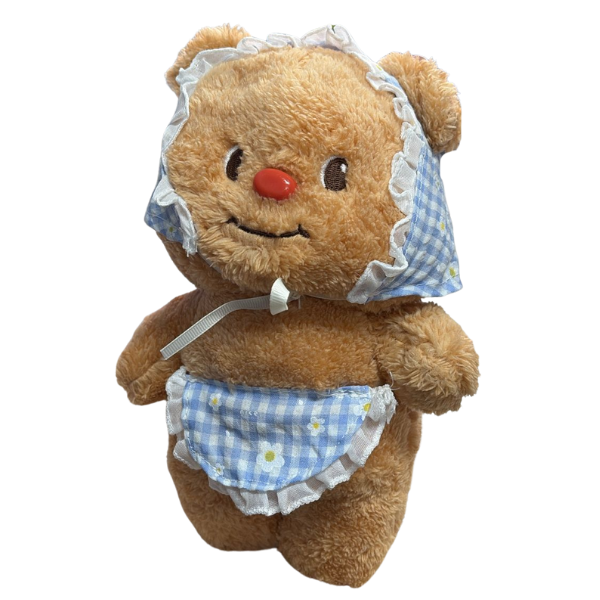 ¡Ternura pura en cada detalle!  Este adorable peluche de osito viene vestido con un encantador pañuelo y un mandil de cuadros azules con encaje blanco, dándole un toque clásico y dulce que enamora a primera vista. Su textura extra suave lo hace perfecto para abrazar, decorar o regalar.