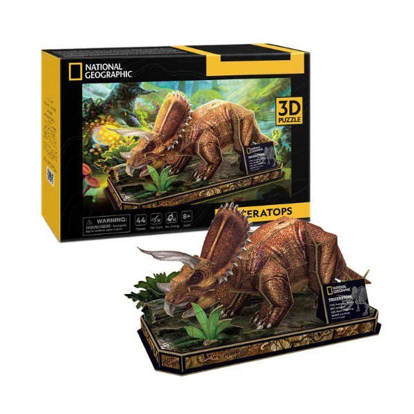 Lleva la prehistoria a tu casa con este rompecabezas 3D de Triceratops de CubicFun, parte de la colección de dinosaurios National Geographic. Con 44 piezas ensamblables, este modelo te permite construir una figura tridimensional del famoso dinosaurio herbívoro con un diseño realista y llamativo.