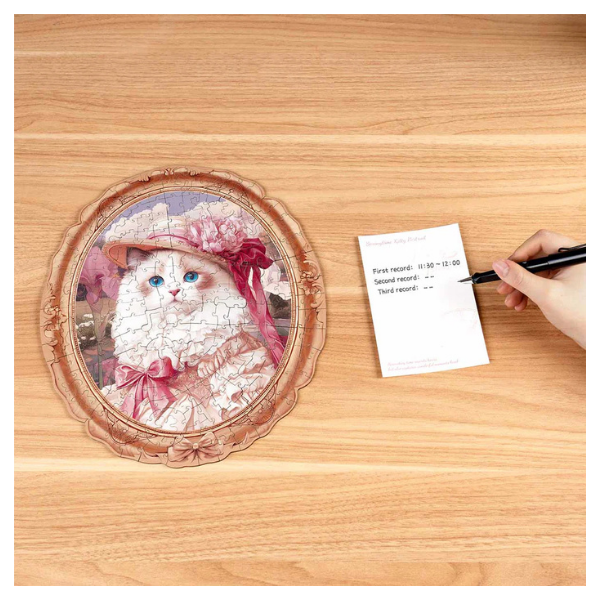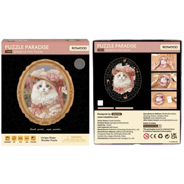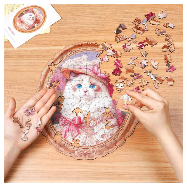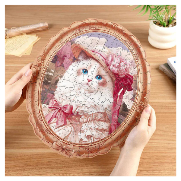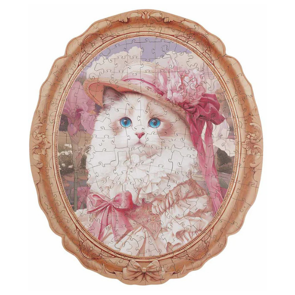 El modelo Springtime Kitty Portrait es un rompecabezas de madera que combina arte y creatividad en una pieza decorativa única. Presenta el retrato de un elegante gato con estilo vintage, rodeado de tonos suaves y detalles que evocan la frescura de la primavera.